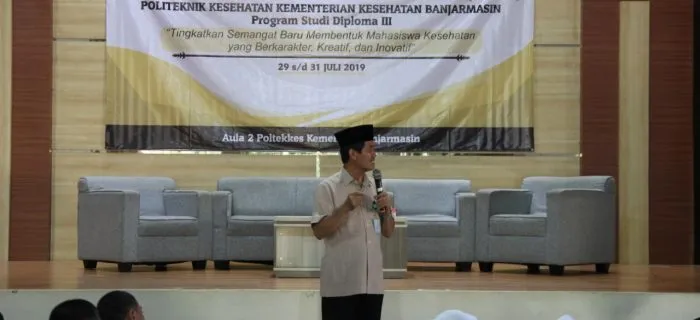 bagian dari keluarga Poltekkes Kemenkes Banjarmasin. Beliau juga mengatakan bahwa keegiatan PKKMB 2019 ini adalah menyiapkan mahasiswa baru melewati proses transisi dari Siswa menjadi Mahasiswa Poltekkes Kemenkes Banjarmasin yang dewasa dan mandiri, serta mempercepat proses adaptasi mahasiswa dengan lingkungan yang baru dan memberikan bekal untuk keberhasilannya menempuh pendidikan di perguruan tinggi maka dilakukan Pengenalan Kehidupan Kampus Bagi Mahasiswa Baru (PKKMB) Poltekkes Kemenkes Banjarmasin 2019. Masa ini dapat dijadikan titik tolak pembinaan idealisme, penguatan rasacinta tanah air, dan kepedulian terhadap lingkungan, juga dalam rangka menciptakan generasi yang berkarakter religius, nasionalis, mandiri, gotong royong,dan berintegritas.