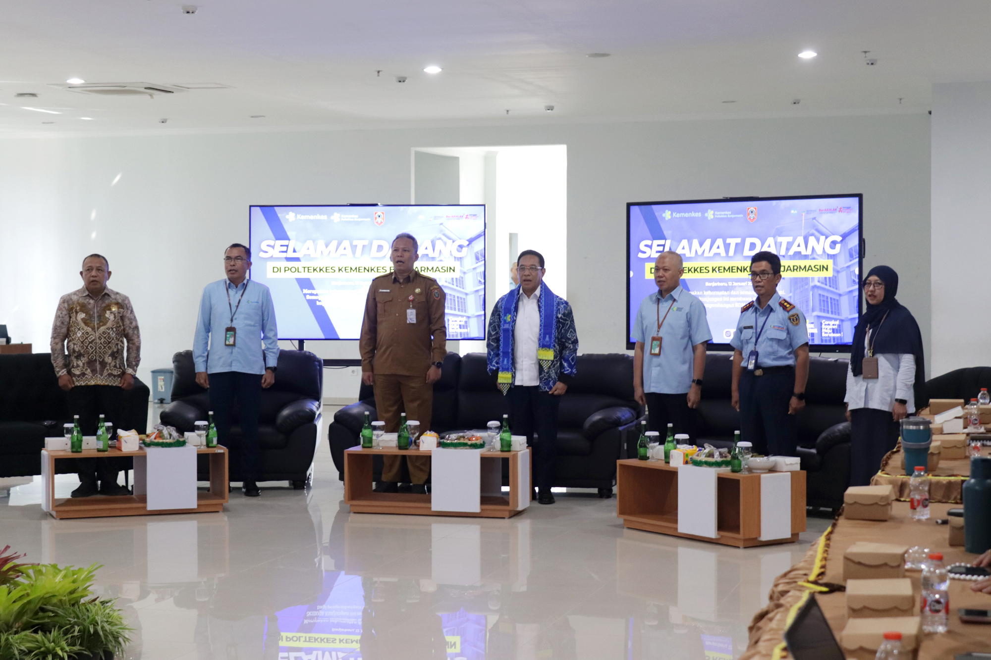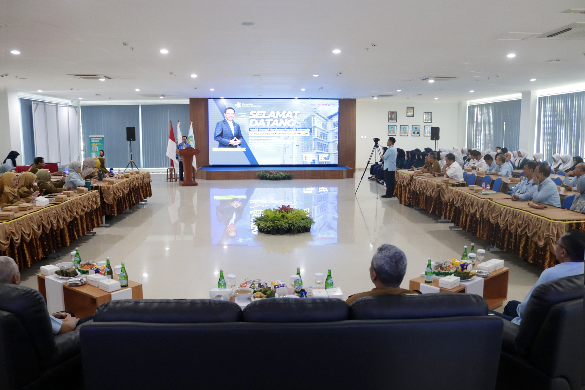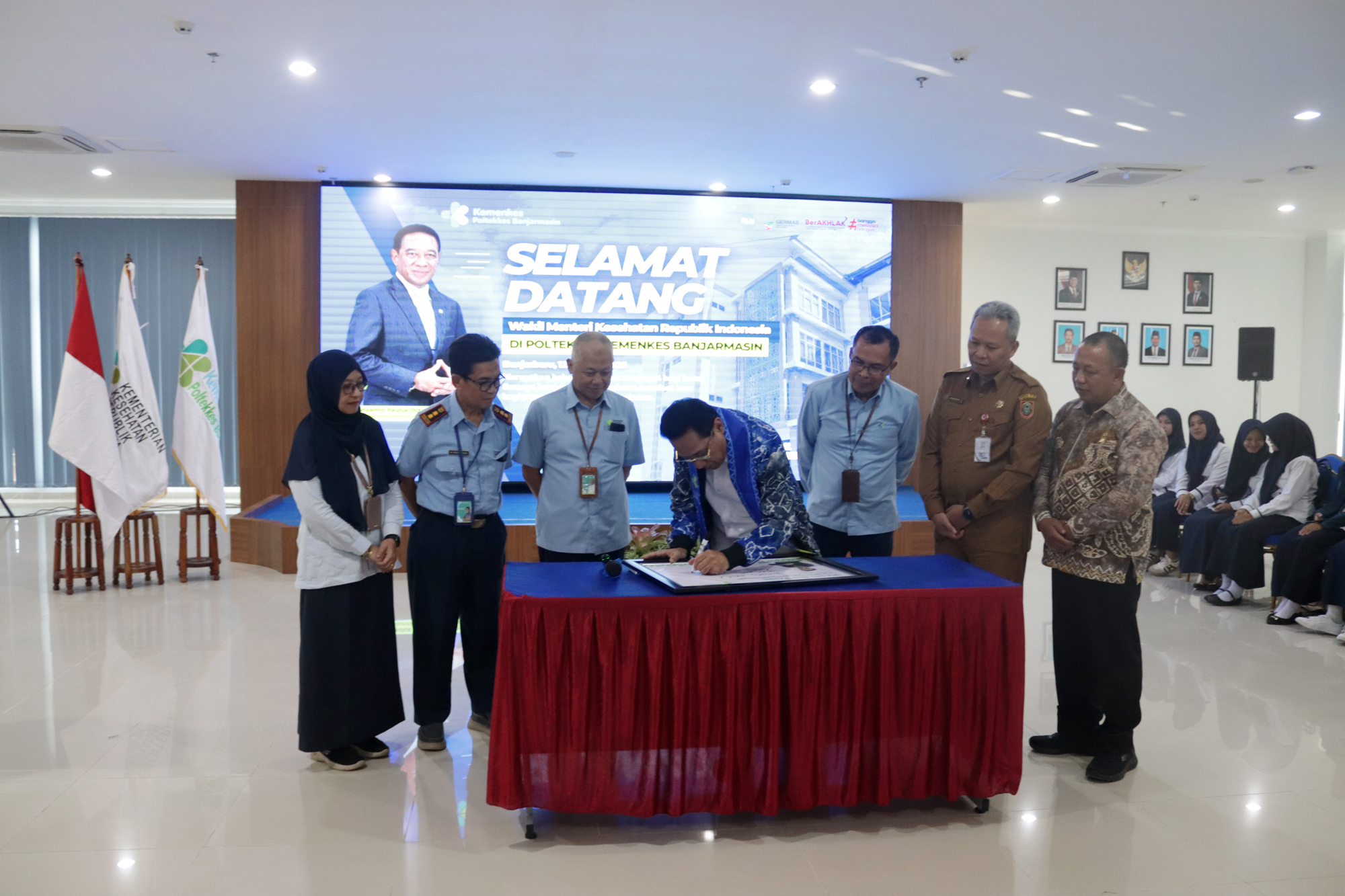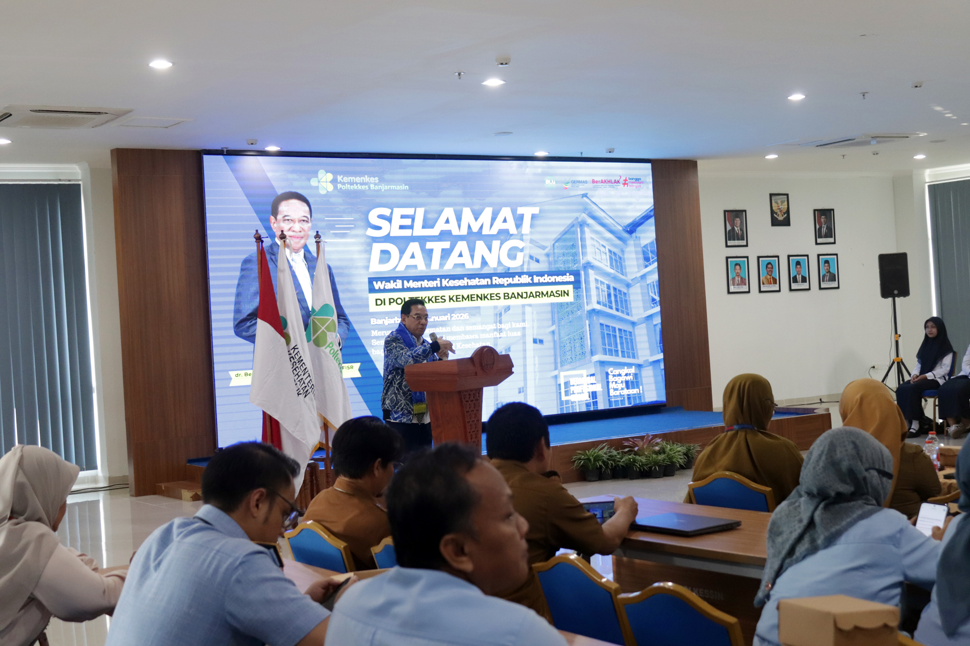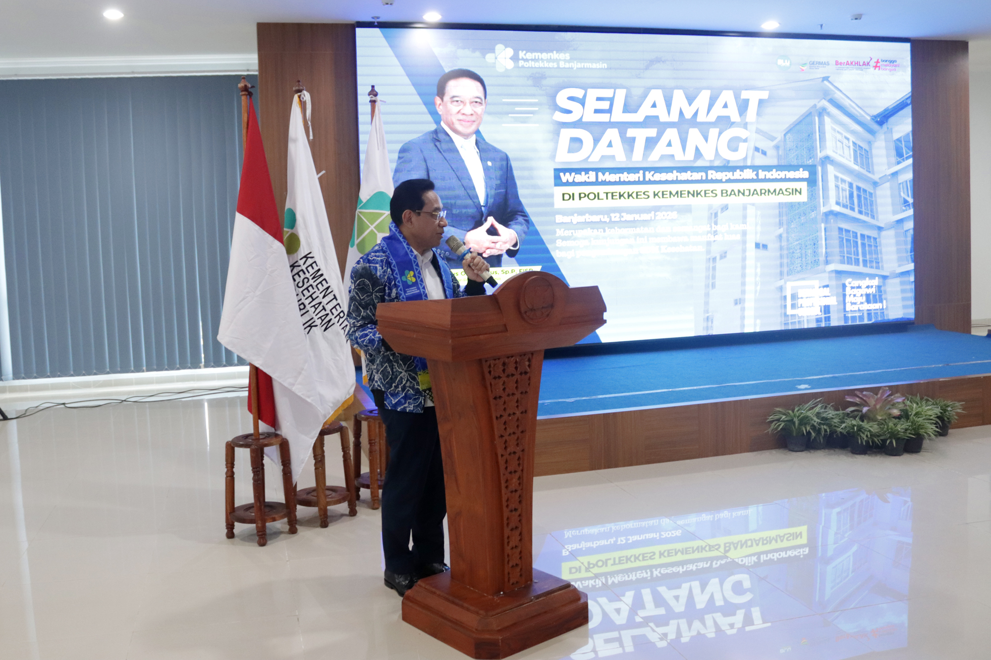 Kedatangan Wakil Menteri Kesehatan disambut langsung oleh Plt. Direktur Poltekkes Kemenkes Banjarmasin, Dr. Junaidi, SKM., MS, bersama dosen dan mahasiswa. Turut hadir Kepala Dinas Kesehatan Provinsi Kalimantan Selatan dr. Diauddin, M.Kes, Kepala BBLKM Banjarbaru Budi Santoso, S.KM., MPH, Plt. BKK Kelas I Banjarmasin M. Rasyid Ridha, SKM., MKL, Kepala LAPFK Banjarbaru Yuni Irmawati, SKM., MA, Anggota DPRD Provinsi Kalimantan Selatan Nur Fajri SE serta unsur pimpinan Poltekkes Kemenkes Banjarmasin yang meliputi para Wakil Direktur, Kepala Subbagian, dan Kepala Pusat.
