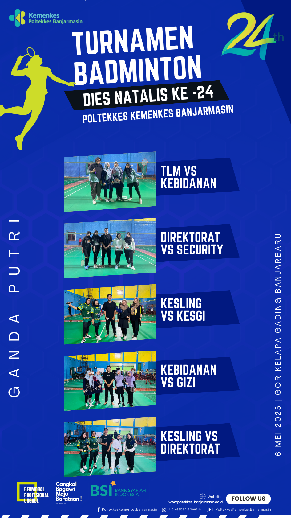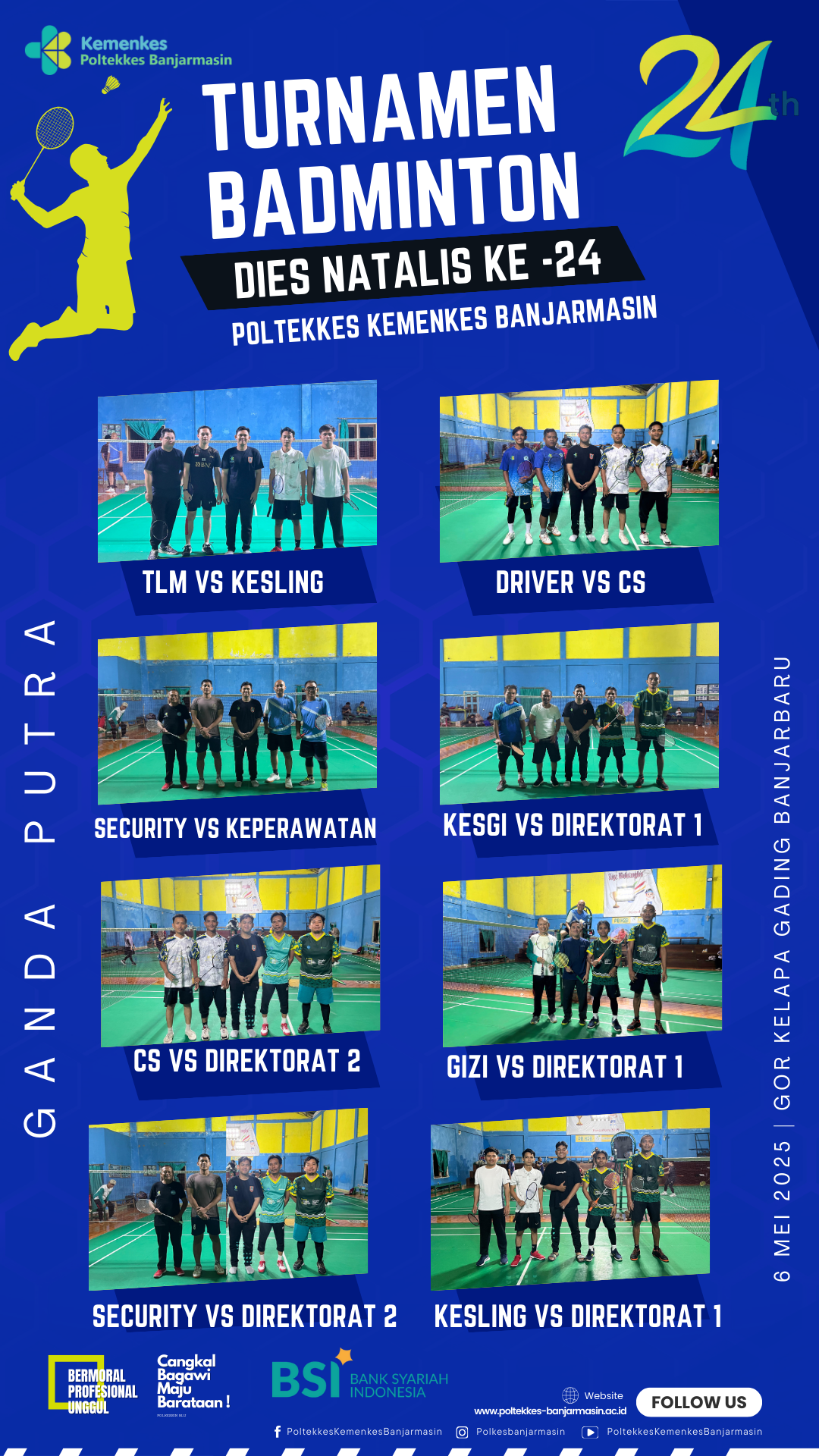 Dalam rangka memperingati Dies Natalis ke-24, Poltekkes Kemenkes Banjarmasin menyelenggarakan Turnamen Badminton Internal yang berlangsung pada tanggal 6 dan 13 Mei 2025 di GOR Kelapa Gading, Kota Banjarbaru. Kegiatan ini diikuti oleh 18 tim yang terdiri dari 10 tim ganda putra dan 8 tim ganda putri yang berasal dari unsur dosen, tenaga kependidikan (tendik), dan tenaga outsourcing di lingkungan Poltekkes Kemenkes Banjarmasin.