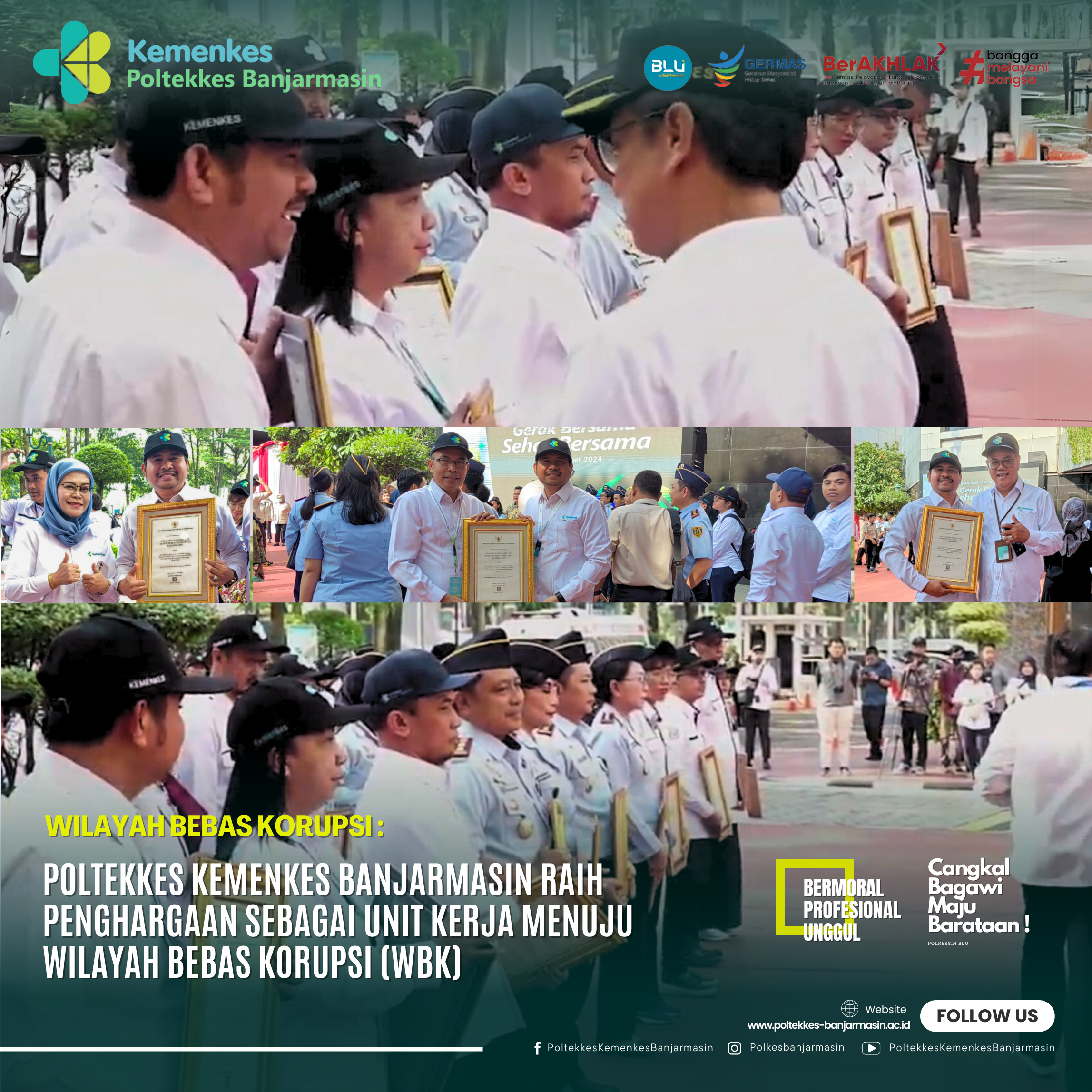 Penghargaan ini diserahkan pada Upacara Peringatan Hari Kesehatan Nasional (HKN) ke-60 yang berlangsung di Jakarta pada 12 November 2024. Penghargaan tersebut diberikan sebagai apresiasi terhadap komitmen Poltekkes Banjarmasin dalam menerapkan prinsip-prinsip transparansi, akuntabilitas, dan integritas di setiap lini kegiatan. Sebagai bagian dari Kementerian Kesehatan, Poltekkes Banjarmasin telah menunjukkan upaya maksimal untuk mencegah tindakan korupsi, meningkatkan kualitas pelayanan publik, serta menciptakan lingkungan kerja yang bersih dan bebas dari penyimpangan.